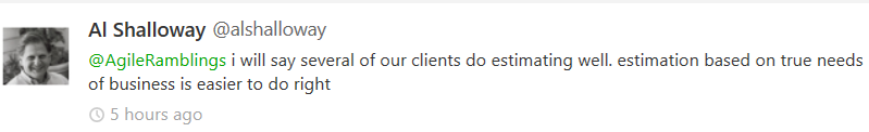 Since then, I’ve seen a bit of a swell on twitter of the #noestimates hashtag and a lot of discussion on topic. I was recently saw a tweet from Allan Shalloway that prompted a bit of a conversation: