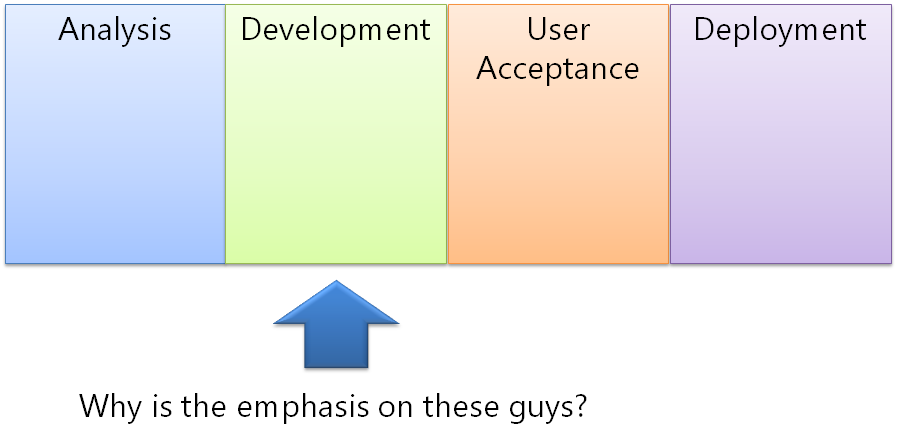 As we can see in the workflow, there are several phases of life that a feature/user story/use case goes from to be brought to life, only one of which is development. Often, there are many tasks across elaboration/analysis, development, quality assurance, user acceptance and IT/Ops just to name a few common phases. Are developers performing all of these tasks? Do they take into account the effort required in all of the other disciplines when they do their estimates?