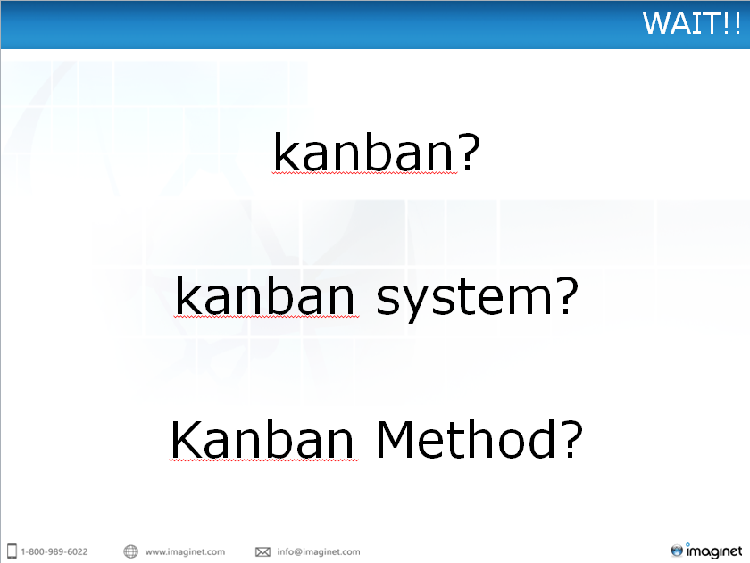 I’m the first to agree that there is a lot of confusion around the word kanban. In all of my webinars and presentations, I take a moment to provide some clarity on this issue. I think it’s very important that we all do this.